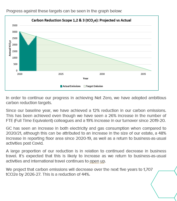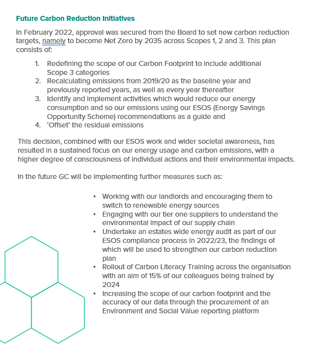 Since our baseline year (2019/20), we’ve achieved a 12% reduction in our carbon emissions, even though we’ve seen a 26% increase in full-time equivalent colleagues and a 19% increase in our turnover since 2019/20.